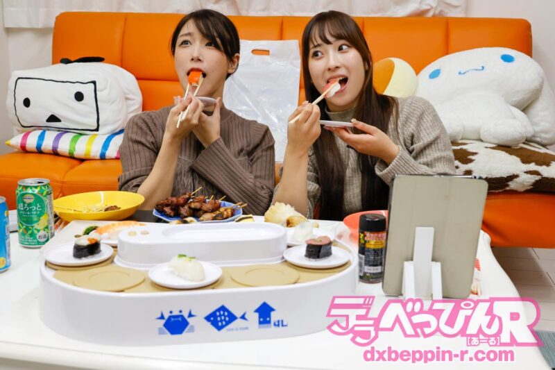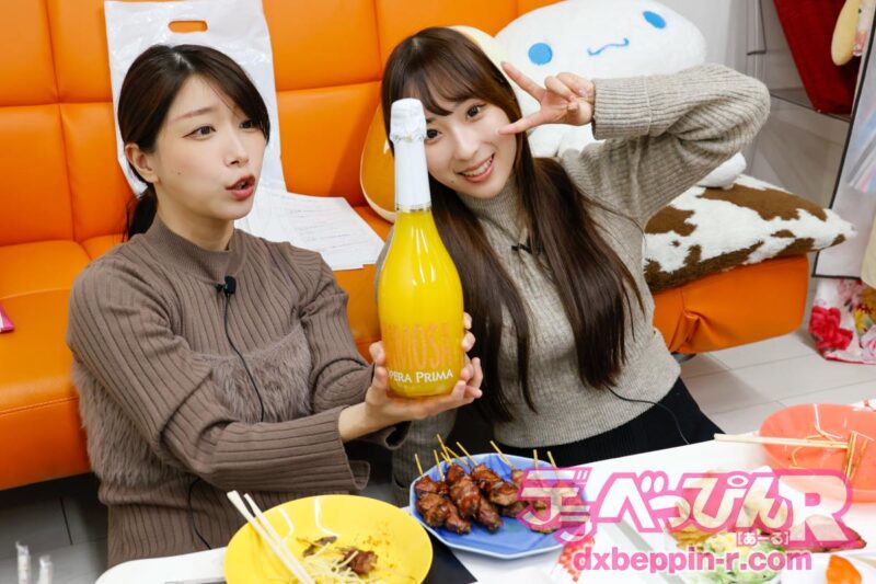 また、焼き鳥には激辛一味をたっぷりかけて挑む2人でしたが、意外と平気な顔で完食。さらに回転寿司、スパークリングワインと豪華差し入れの波が止まらず、みのりちゃんはマグロ、みっひーはサーモンをチョイス。