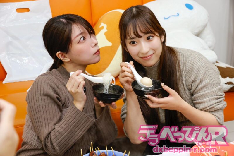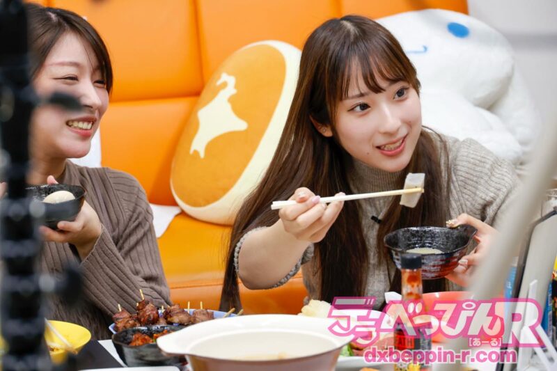 お互いに食べさせあいっこが始まり、卵を口に入れられたみっひーは「熱っ!!」と悶絶しますが、白滝を口に入れられたみのりちゃんは「ちょっと冷めてるかも」と衝撃の発言をして、美味しそうに食べていました(笑)。