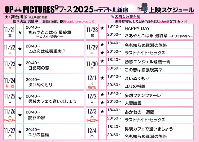 多くの人気セクシー女優が出演する『OP PICTURES+フェス2025』は12月4日まで開催され、期間中には舞台挨拶も多数予定されています。最終日までR15版ピンク映画の魅力をたっぷり楽しみましょう!