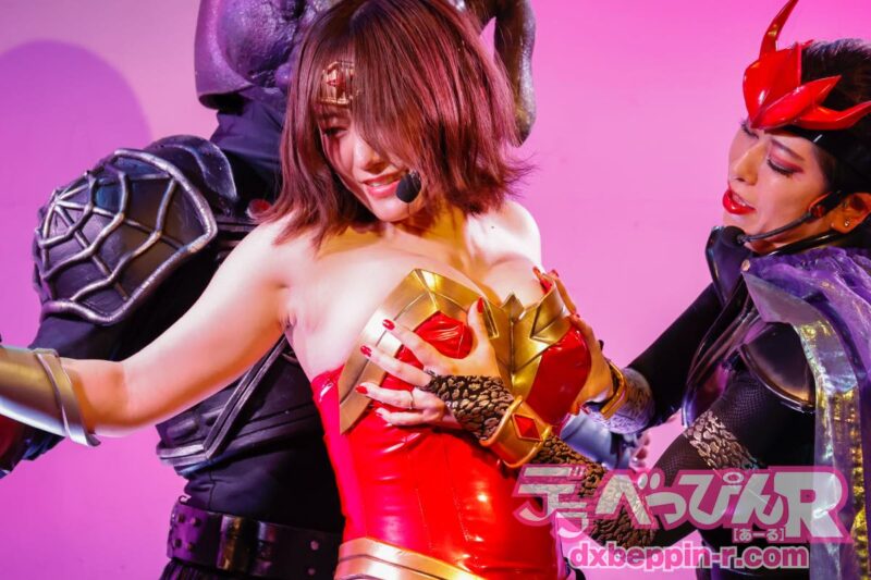 まずはののかちゃんが怪人と激闘を繰り広げますが、バットのような武器で殴打され劣勢に。怪人に捕らえられると、暗黒女帝が登場。美巨乳が強調されたコスチュームを着ているののかちゃん。貪るように胸を揉みしだき、電マに似た凶器を取り出して股間を執拗に責め立てます。甘い喘ぎを漏らしながら耐えきれず、ののかちゃんは悶絶撃沈。最後に生気を吸い取られてしまいました。
