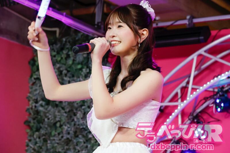 純白のアイドル衣装でステージに登場すると、「うお~!」という大声援が巻き起こり、さっそくライブに突入。1曲目は『初恋サイダー』(Buono!)で、会場のテンションを一気に引き上げ、フロアは早くもスパーク状態に。無数のサイリウムが振られ、咲花ちゃん自身もサイリウムを手に、客席と一体となってライブを楽しみます。