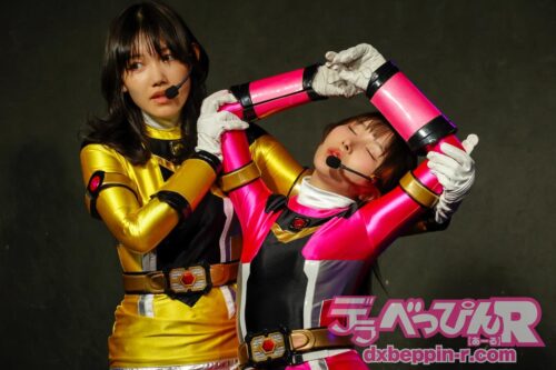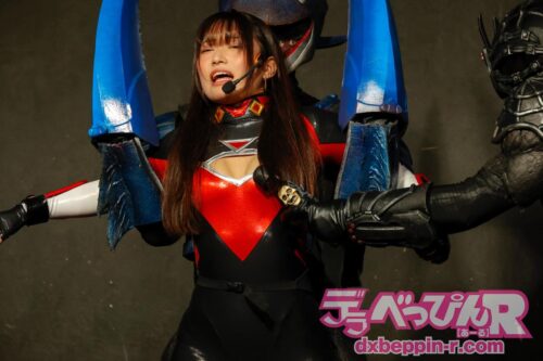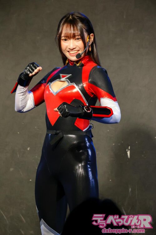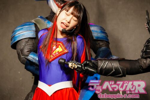 ショーが始まると、悪の軍団が地球侵略のために襲来するストーリーが展開。そこに立ち向かったのはすみれちゃん。サメ型怪人を相手に果敢に奮闘し、ギブアップ寸前まで追い込みます。しかし、もう1人の怪人が乱入し、状況は一変。2対1を強いられ、さらに胸をサメ型怪人のノコギリ状のヒレで責められ、逆に追い込まれてしまいます。
