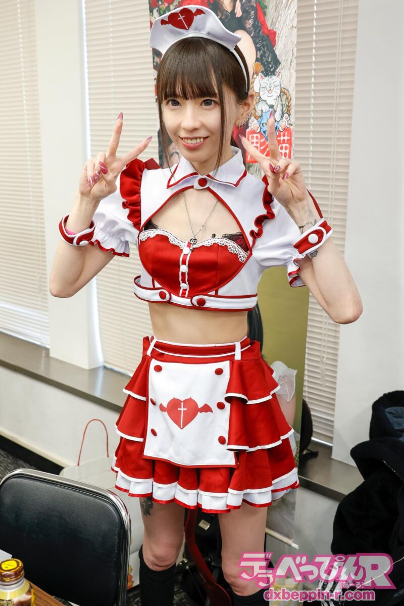 超美人インフルエンサーのおつるちゃんは、セクシーナース姿でブースに立ち、チェキ撮影や動画撮影など撮影系メニューを中心に展開していました。