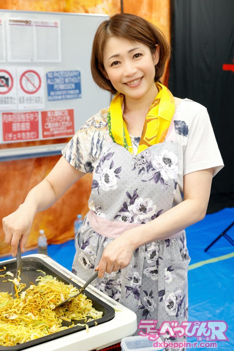 友田真希さんはフェチフェス本部で、スタッフや出演者に振る舞う焼きそばを調理。大人気女優が焼きそばを作ってくれるのも、フェチフェスならではの光景です。