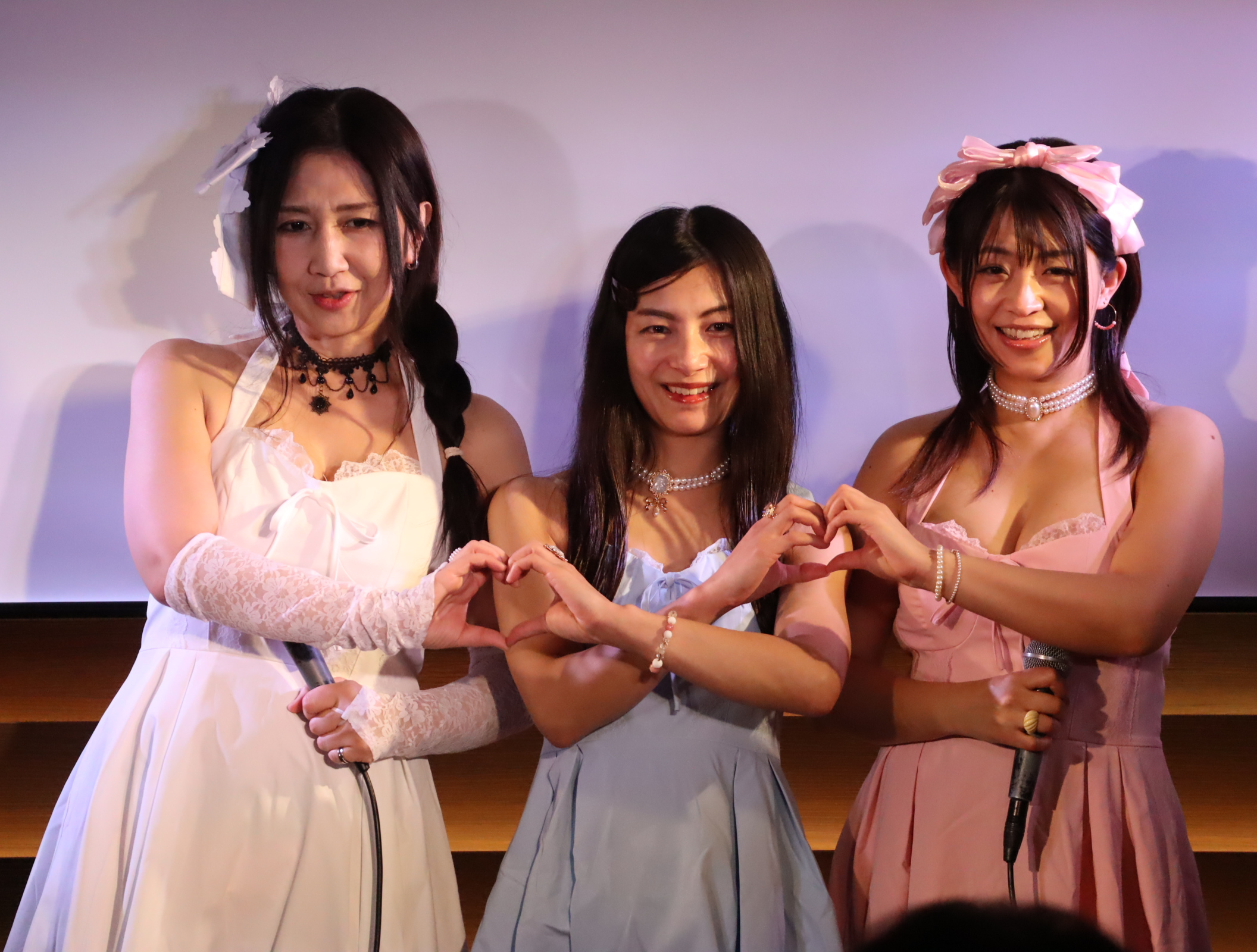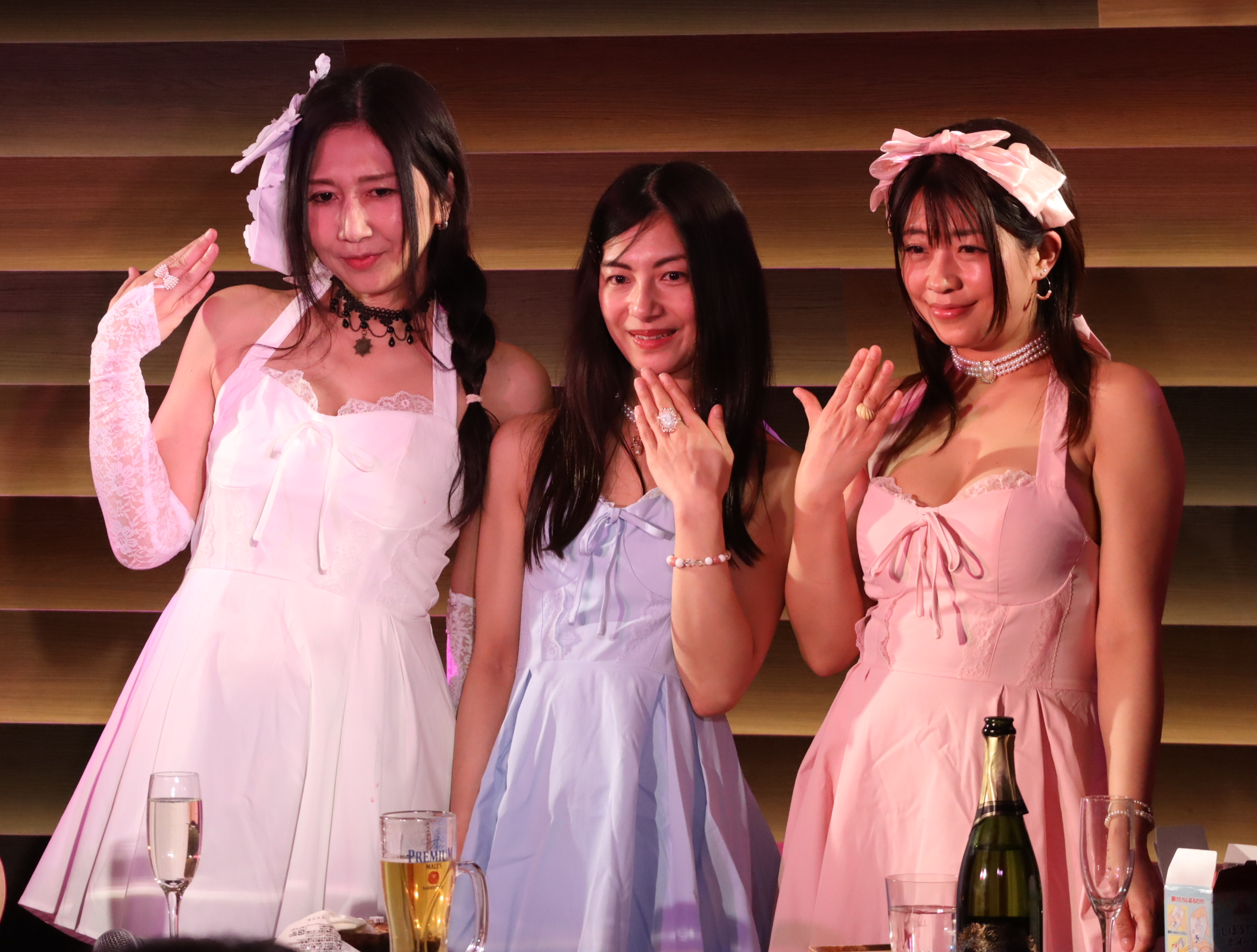 昭和の3人組アイドル・キ〇ンディーズの曲を歌いながら登場した、熟ドルたち。ゲストの熟女AV女優・平清香さんも、お揃いのアイドル風コスチュームで登場です。皆さんとっても可愛らしくてお似合い!会場からも喜びの声があがっています。しかし、伊織さんは「脱ぐより恥ずかしい……」と、終始照れまくっていました。