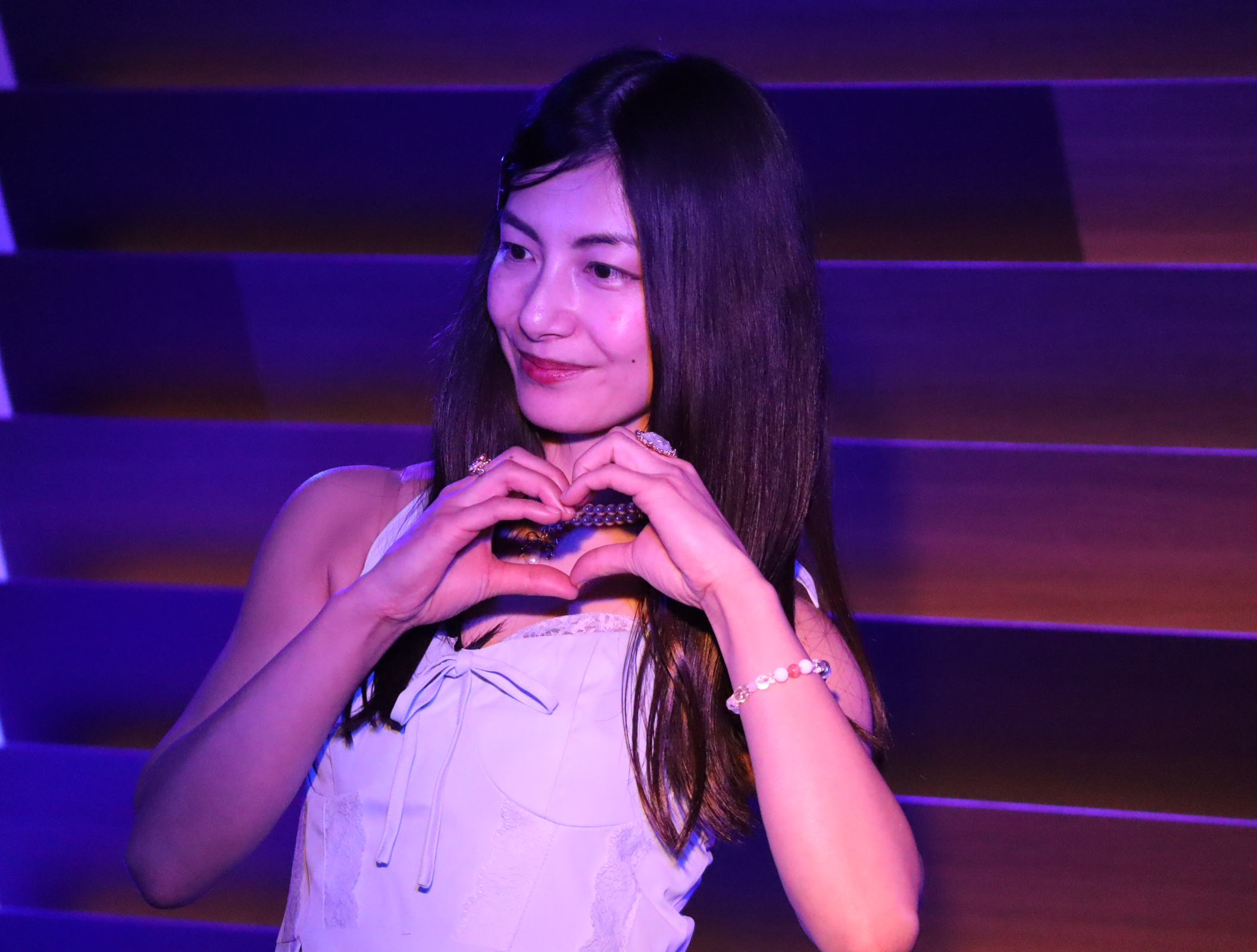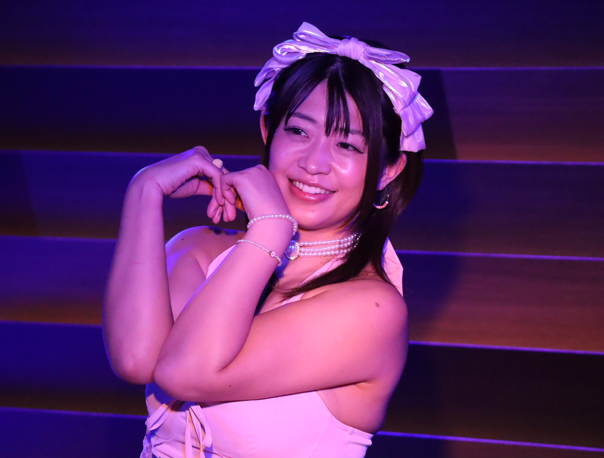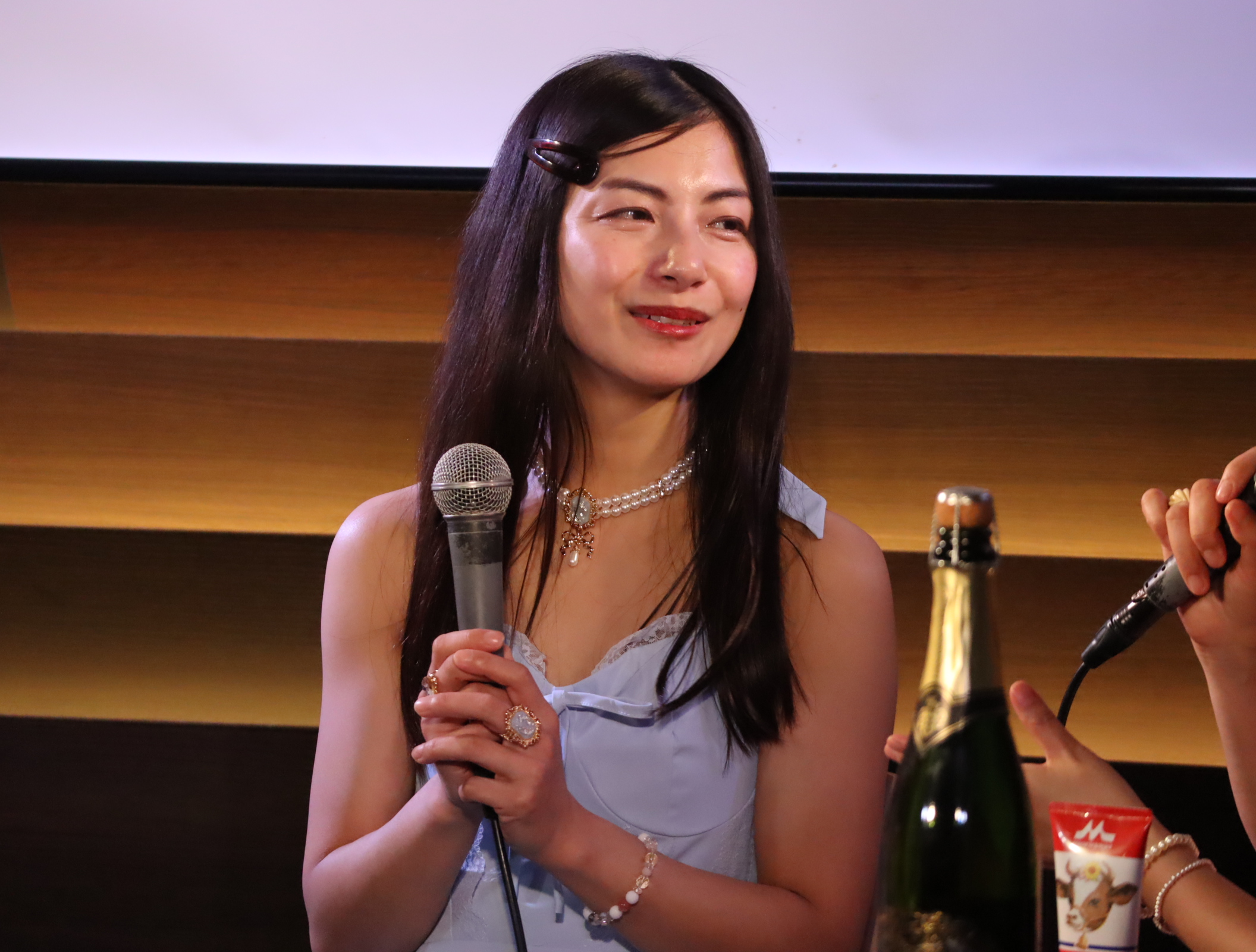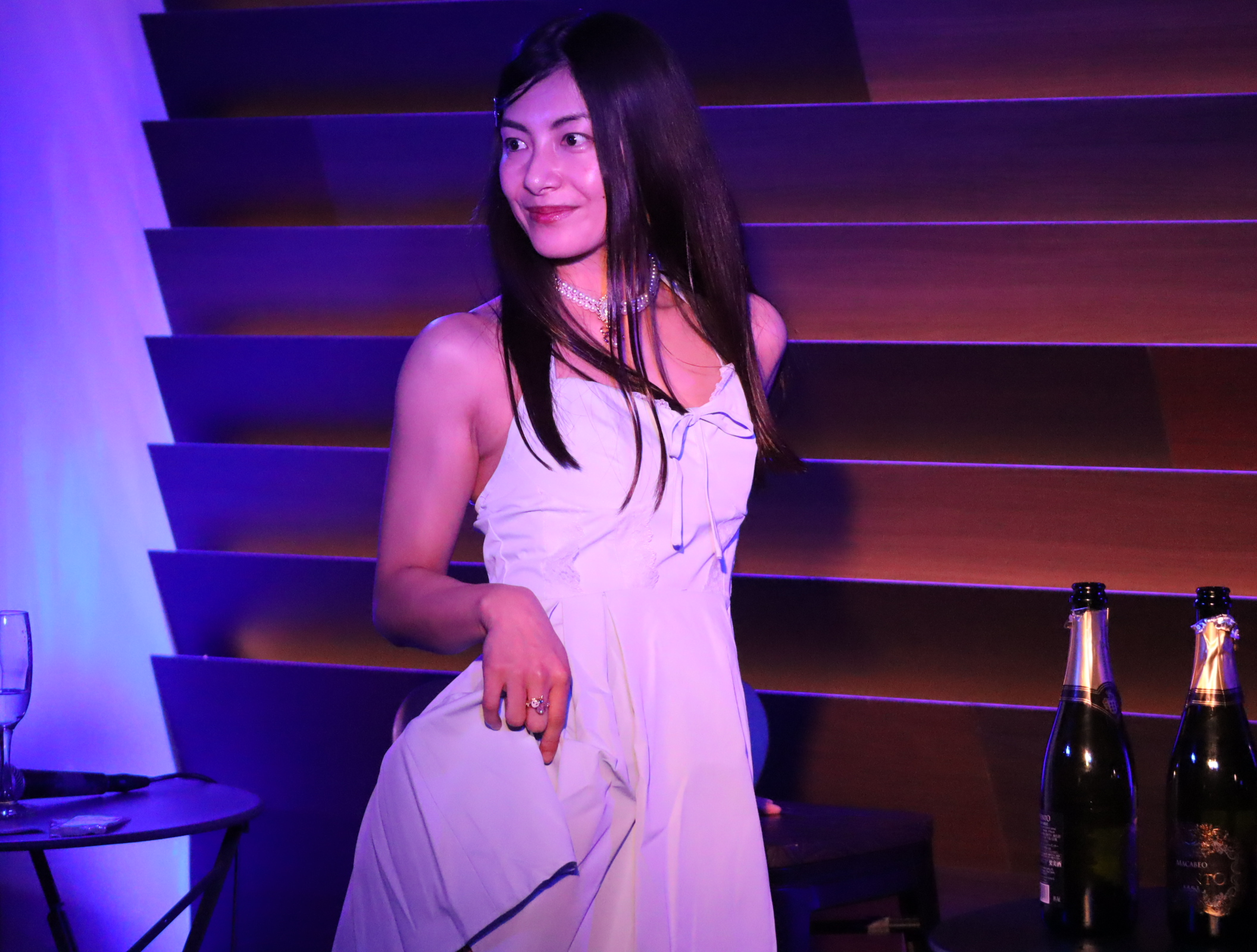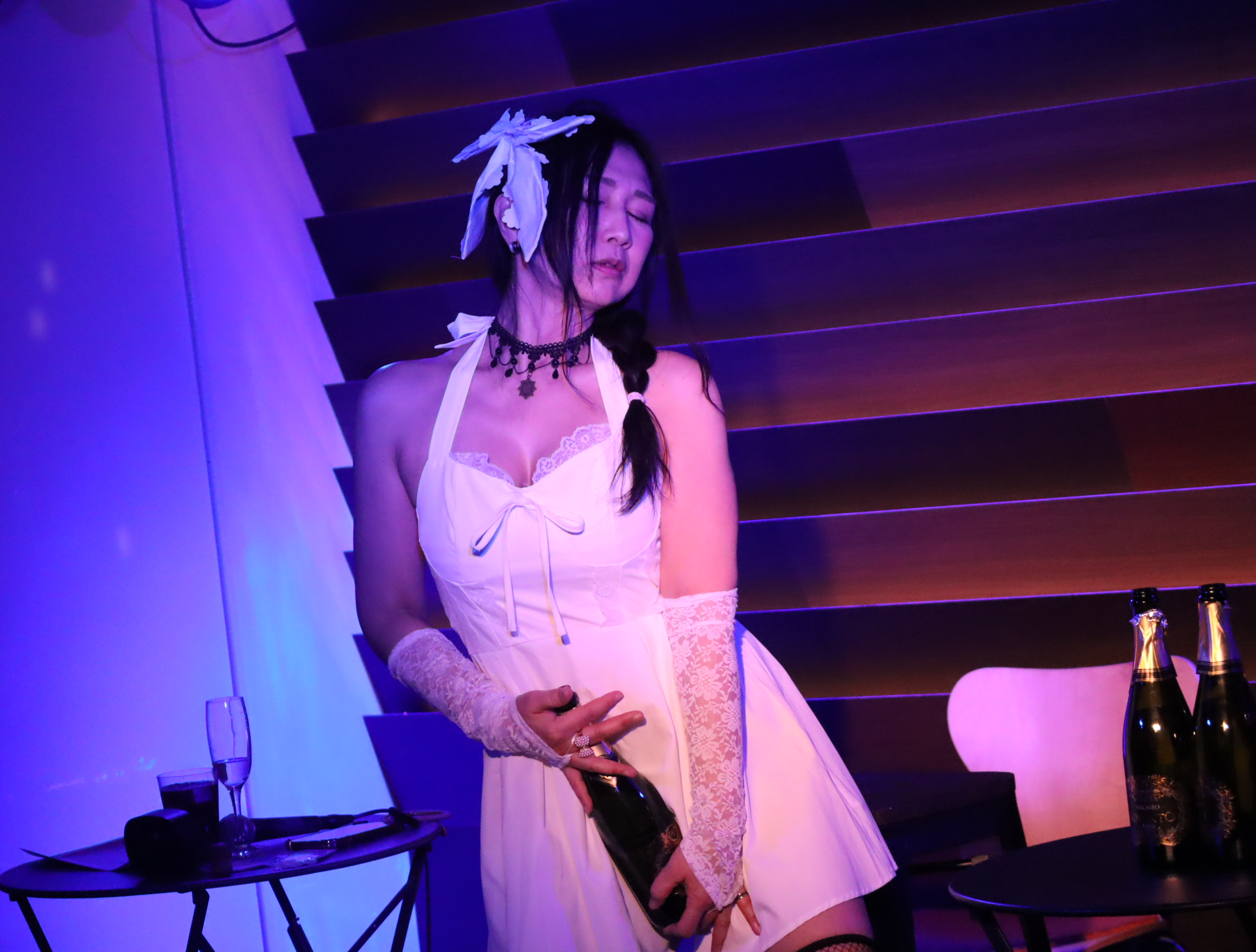 続いては、みんなお楽しみの写真撮影コーナー『ブルー・ライト・ヨコハマ』。あの名曲のタイトルにちなんで青いライトの中で艶めかしくポージングをします。最初のうちは可愛いアイドル路線を頑張っていた伊織さんですが、しっかり途中から路線変更。シャンパンを駆使して見事なテクニックを見せつけていました。