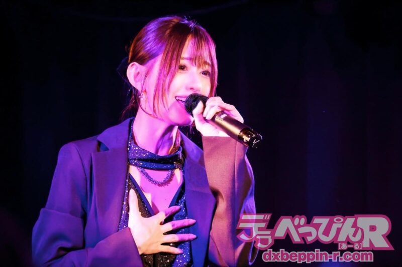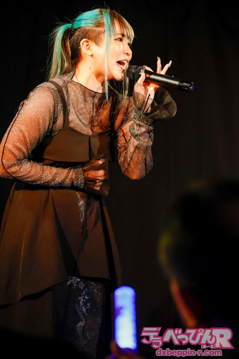 あいりさんはライブに久しぶりの登場。アダルティな雰囲気を身にまとい、オリジナル曲の『Resistance』『悪戯』『叶わぬ恋』『Desire』といった名曲を熱唱。どの曲もおなじみのため、ファンもコールで後押しし、大いに盛り上がりました。