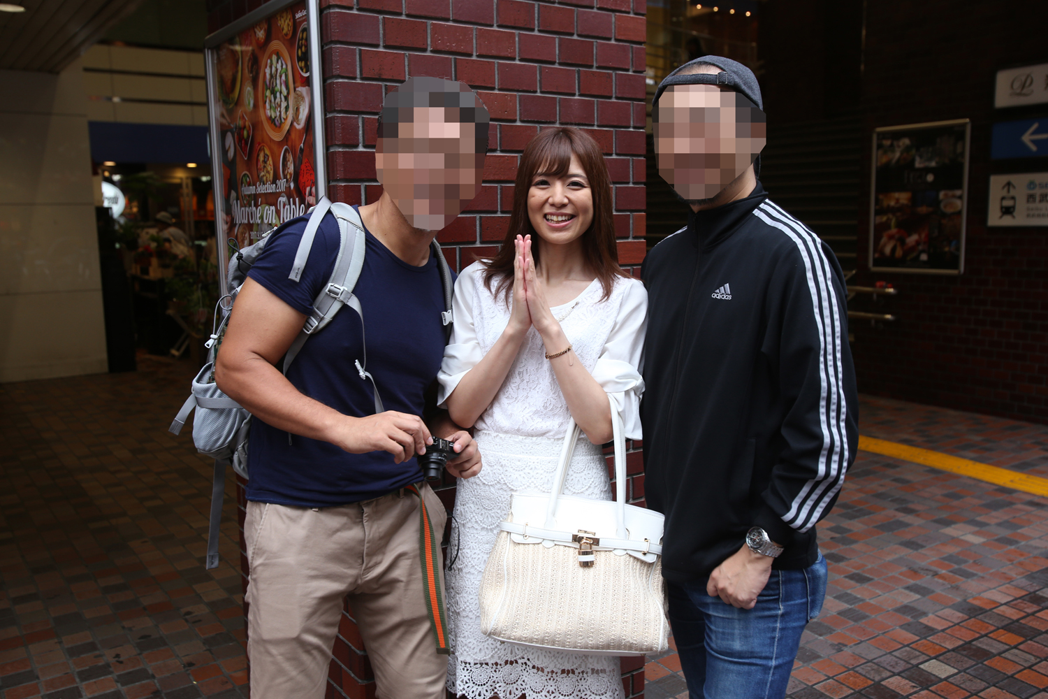 待ち合わせ場所にやってきた秋山夫婦(写真中央と右側)と一緒に記念撮影。変態のダンナさんはもちろん、美人ヅマの優子さんもかなり乗り気なご様子。