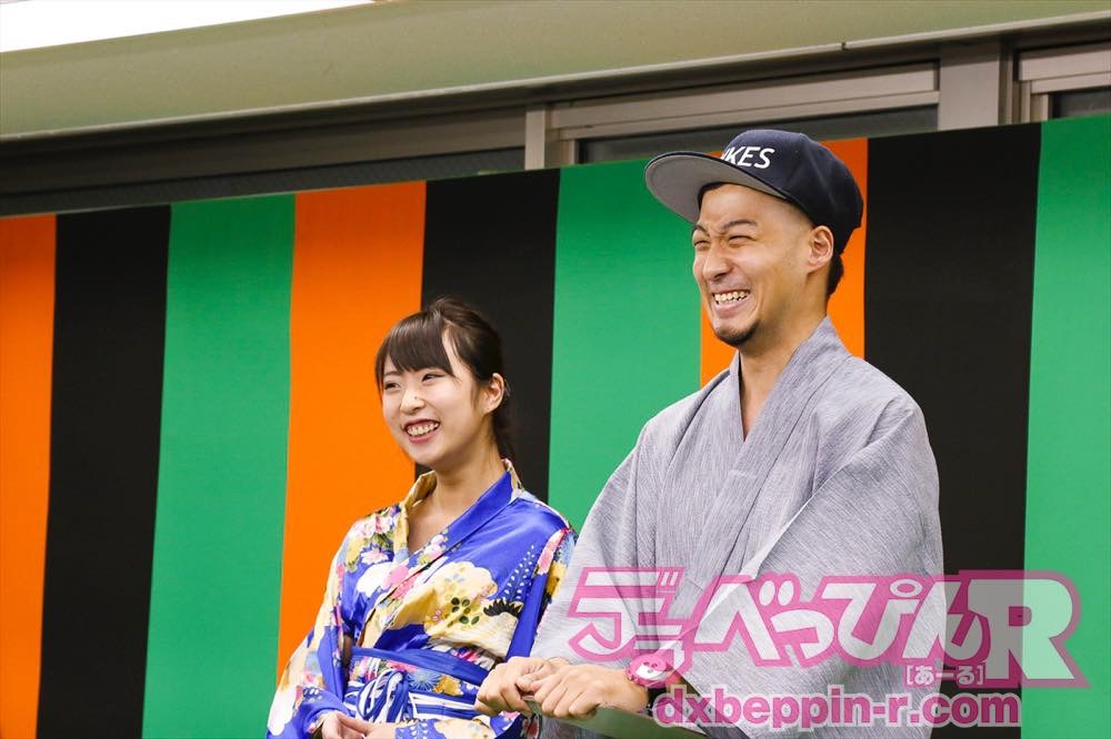 満員の観客に迎えられ大喜利出演者が浴衣姿で登場。長瀬麻美ちゃん、初美りんちゃん、有花もえちゃんのMAX-A専属3人とAIKAちゃん、波多野結衣ちゃん、大槻ひびきちゃんが本日の出演者です。