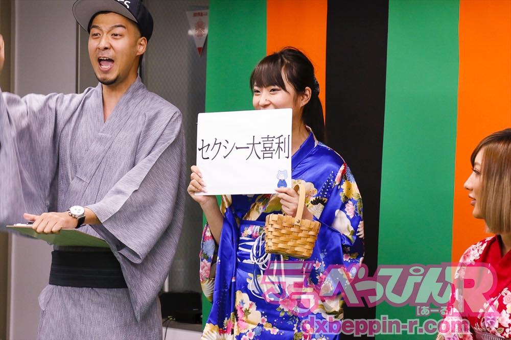 続いて新年らしく「セクシー二人羽織」に挑戦。普通の二人羽織でも難しいのですが、ゲストのジョーク東郷さんに狙い撃ちされると、そのリアクションをしなくてはなりません。