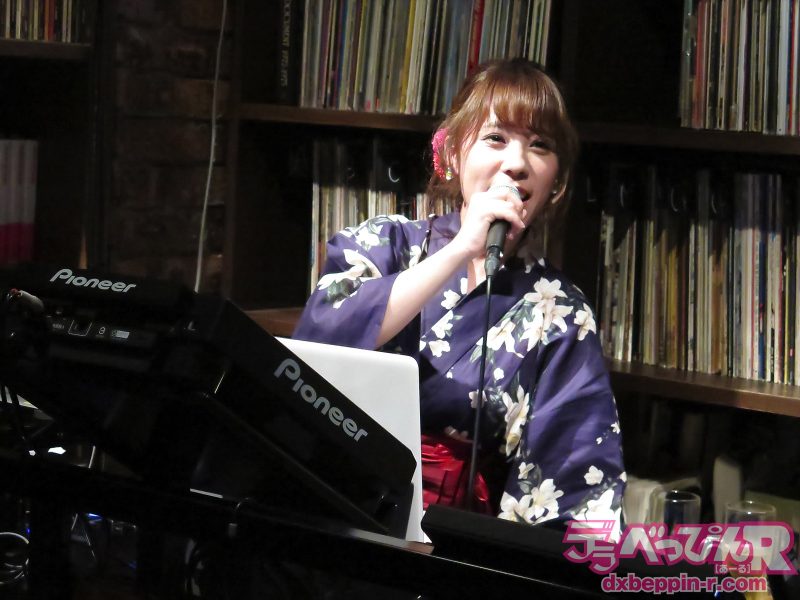 夏らしく浴衣姿で登場したあみちゃん。酔っ払う前に早速チェキ会からスタート。ファンと熱心に会話を交わし名前も覚えています。こういう姿勢が人気の秘訣なんです。