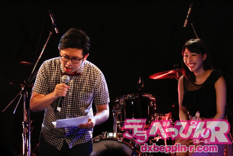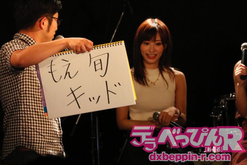 何ともえちゃん所属事務所の社長がギター、司会の青柳貴哉さんボーカルを務めもえちゃんと旬果ちゃんに贈る『もえ旬キッド』(ビートたけしの『浅草キッド』を替え歌にした曲)を披露。