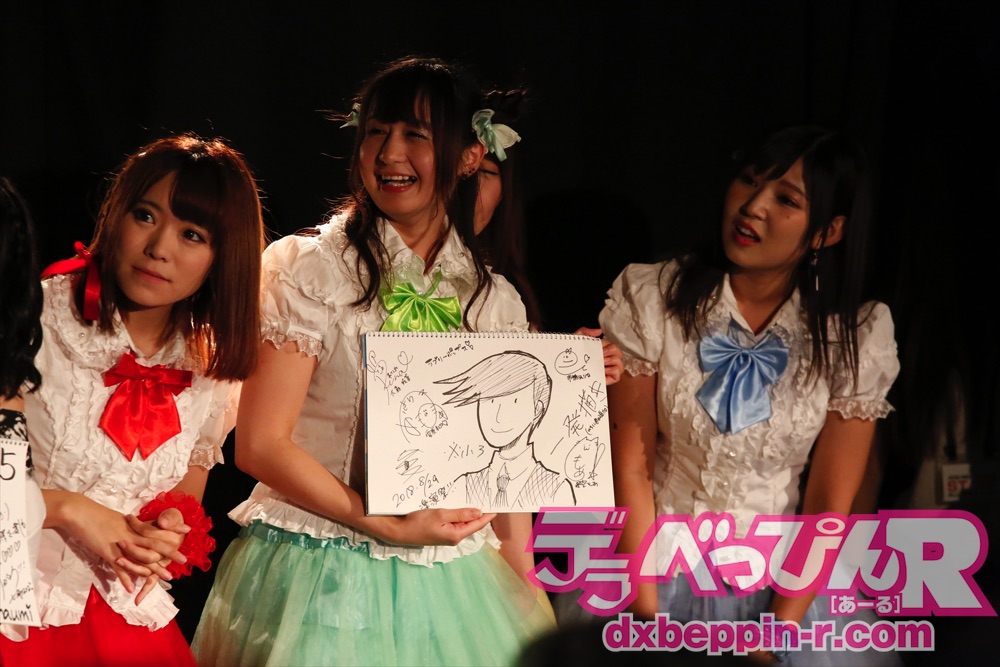 ここでブレイクタイムのゲームコーナーに。ちびまる子ちゃんのキャラクター・花輪くんのイラストを描いて公開。いわゆる“画伯”はおらず、全員かなり上手に描いてきてくれました。客席からの支持でつぼみちゃんがいちばんの高評価。何をさせてもつぼみちゃんはできてしまうんです!