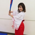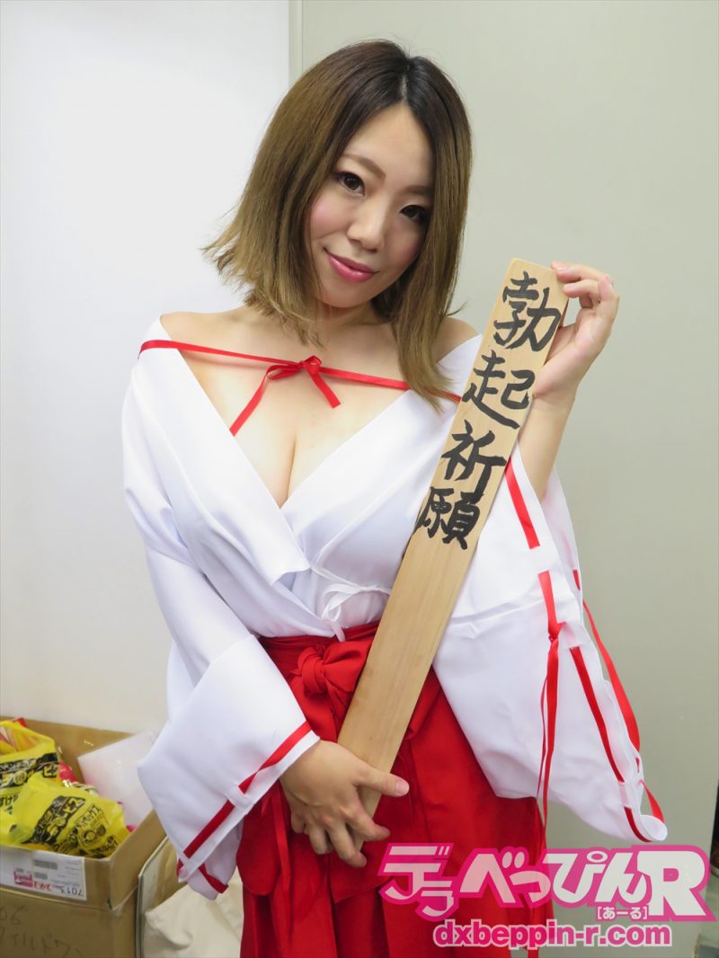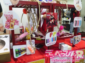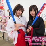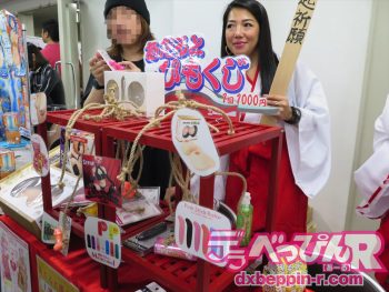 「バイブバーワイルドワン&DNAJAPAN」ブースではおっぱい神社とアダルト紐くじが楽しめました。コスプレモデルの村崎乳業さんと美人広報さんが巫女役で登場。