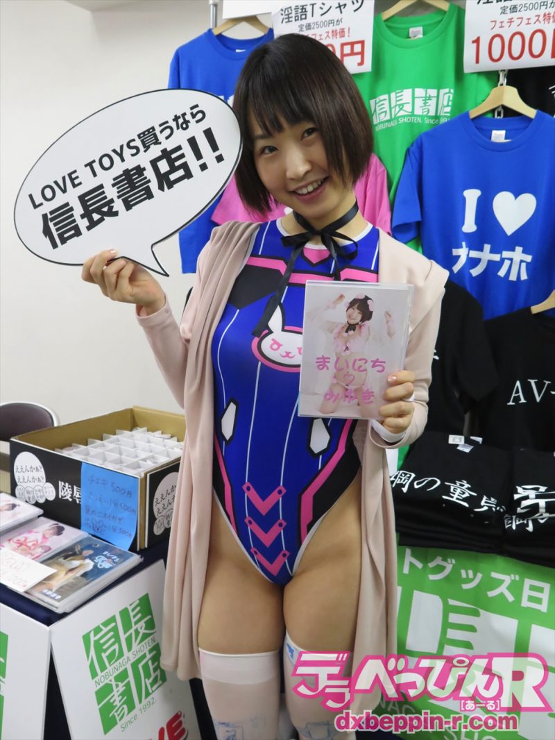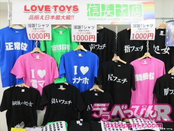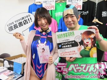 関西を中心に展開するショップ「信長書店」では淫語Tシャツ、淫語バッヂを販売。売り子にはモデルの中野深雪ちゃんと名物店員のヒゲアブラ―さんが参加。