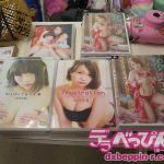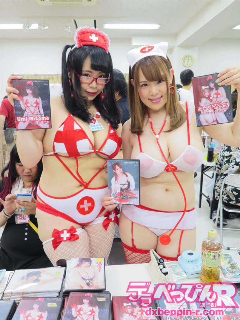 三苫うみちゃんが主宰するサークル「BMIにじゅうろく」ブースには、その三苫うみちゃんと西村ニーナちゃんがセクシーナース姿でDVDなどを販売。サークル名のBMIにじゅうろくは三苫うみちゃんのBMIの数値です。洒落が効いています。