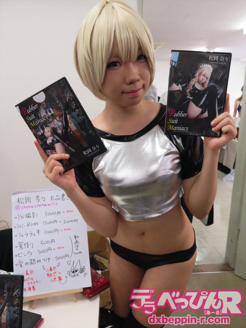 評論サークル「CROSSNEXT」ブースには人気コスプレイヤー松岡奈々ちゃんが売り子で参加。新作コスプレDVDの他に罵声、ビンタのアトラクションも松岡奈々ちゃんに罵声を浴びさせられながらビンタされたい!