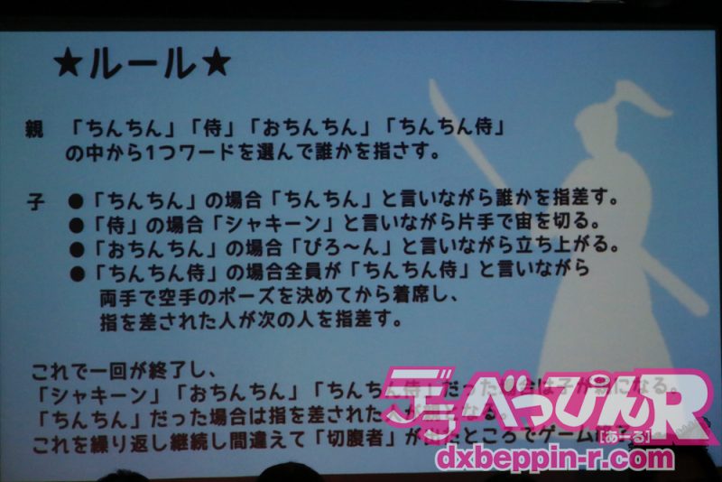 あまりに罰ゲームを警戒し他の出演者がしゃべらないため、急遽、ゲームに変更。「ちんちん侍ゲーム」という往年の合コンゲーム「せんだみつおゲーム」をアレンジしたゲームを行い、真っ昼間から女性陣が「ちんちん!」と大声で叫ぶ展開に(笑)。
