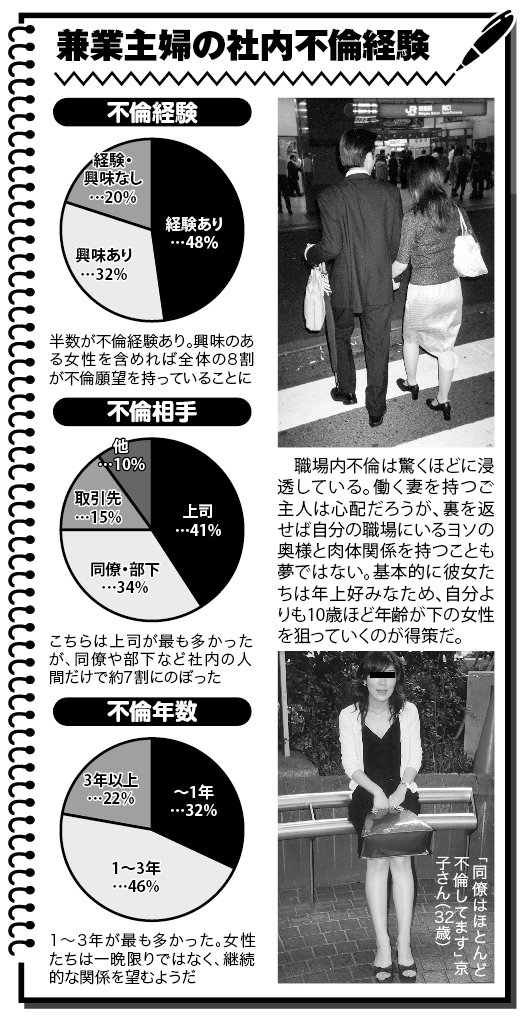 もう一つのグラフ、つまり彼女たちの不倫相手が誰なのかにも注目だ。その4割が職場の上司を挙げているが、総じて人妻は10~20歳くらい年上の男性がお好みの様子。世間的にはイマイチ冴えないと思われている中年層も、働く奥様方にとっては頼れる上司、信頼できる年上の男性ということ。積極的に働きかけていけば入れ喰い状態なのだ。