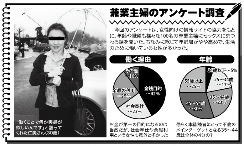 金銭的な事情のため、余暇のヒマ潰しに、社会参加を目的に……色んな理由で働いている兼業主婦たち。彼女たちの性に対する意識をアンケート調査!(前編)