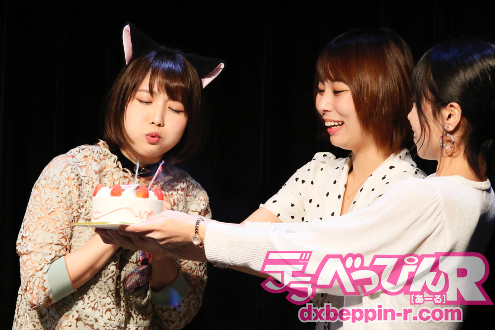 すると、いきなりサプライズで後半ゲストの里咲りさちゃんと姫乃たまちゃんが誕生日祝いのケーキを持って登場。大喜びするまこりん。頬をキュートにぷ~っと膨らましてからロウソクの火を消します。