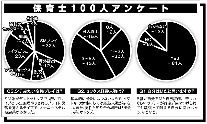 奥手女子の隠れドM。その証拠がQ3の回答。シテみたい変態プレイの内容はスゴイのなんの。そこで次ページからは、保育系女子の子供には言えない恥ずかしいセックス経験を紹介していこう。