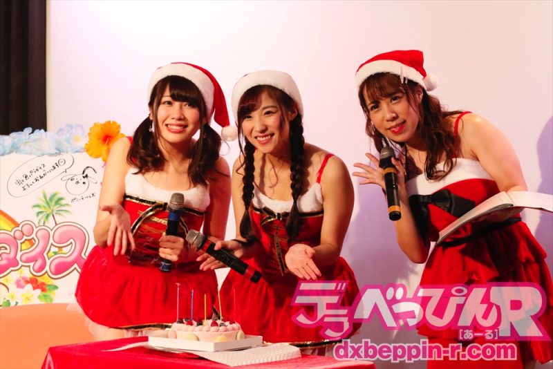 司会のかさいあみちゃんが2人を呼ぶと、トナカイが持ってきたクリスマスプレゼントの袋から登場したセクシーサンタ姿の霧島さくらちゃん、栄川乃亜ちゃんもこの袋から出てくるかと思われましたが普通に登場(笑)。この凸凹感がルルディの魅力。