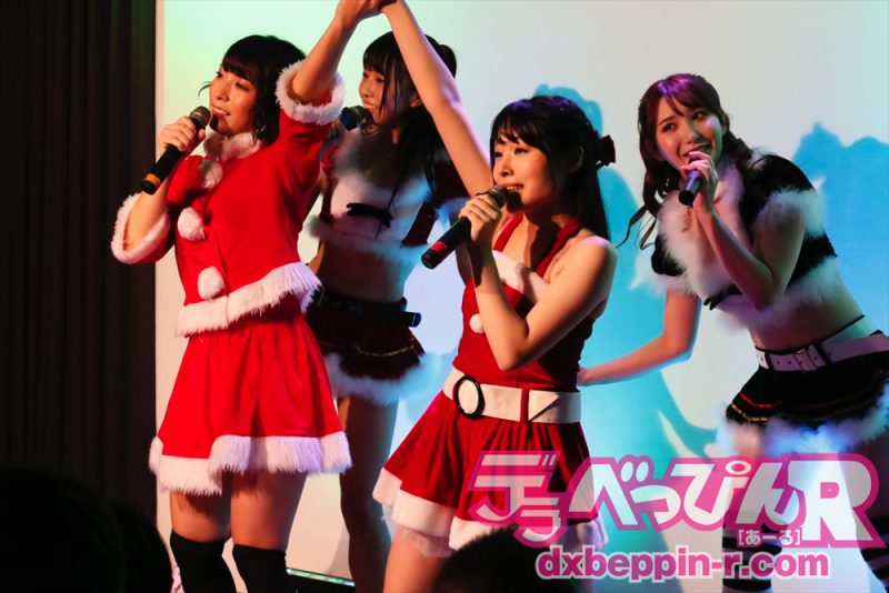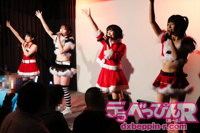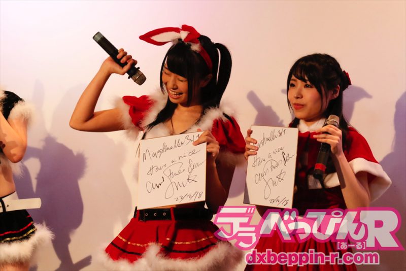 クリスマス間近なのでサンタクロース姿で登場した4人。水嶋アリスちゃんと星咲伶美ちゃんはセクシー系、阿部乃みくちゃんと藤川菜緒ちゃんはキュート系。この絶妙なバランスがマシュマロ3d+人気の秘訣なのでしょう。