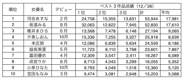 申し訳ないんですがパブ解禁は予想できませんて。ただ今年は12月デビューの女優さんまで漏れなく入れておりますので、ほんの少しですが精度は上がっているだろうと思います(そうであって欲しい)。