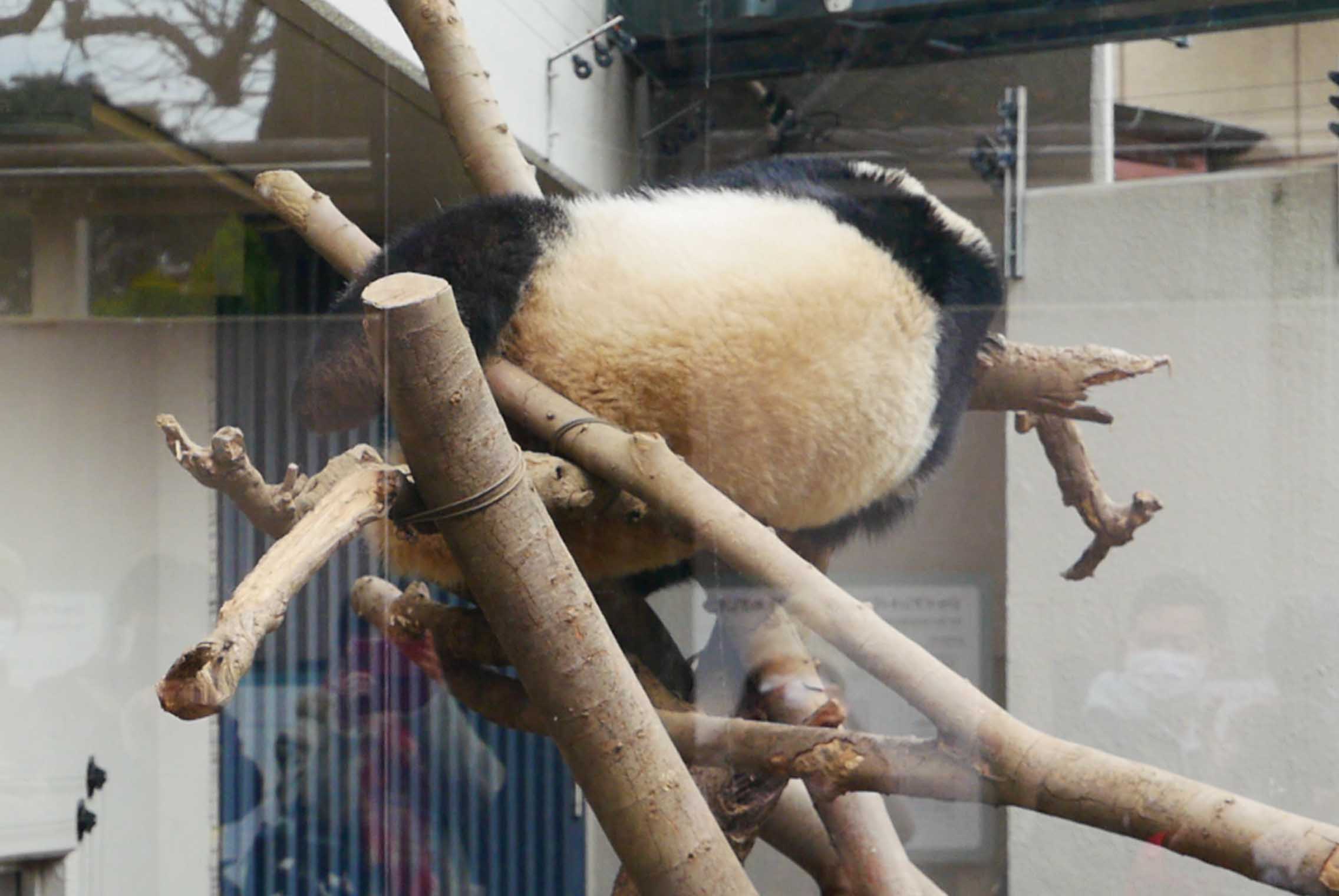 待ちに待ったシャンシャンのお姿がこちら!まさに木に引っかかってますww。どうやらこの体勢のままお昼寝中の模様。寒い中30分待ったのに顔ぐらい見せてほしいよ〜(;_;)。でもつぼみたんいわく