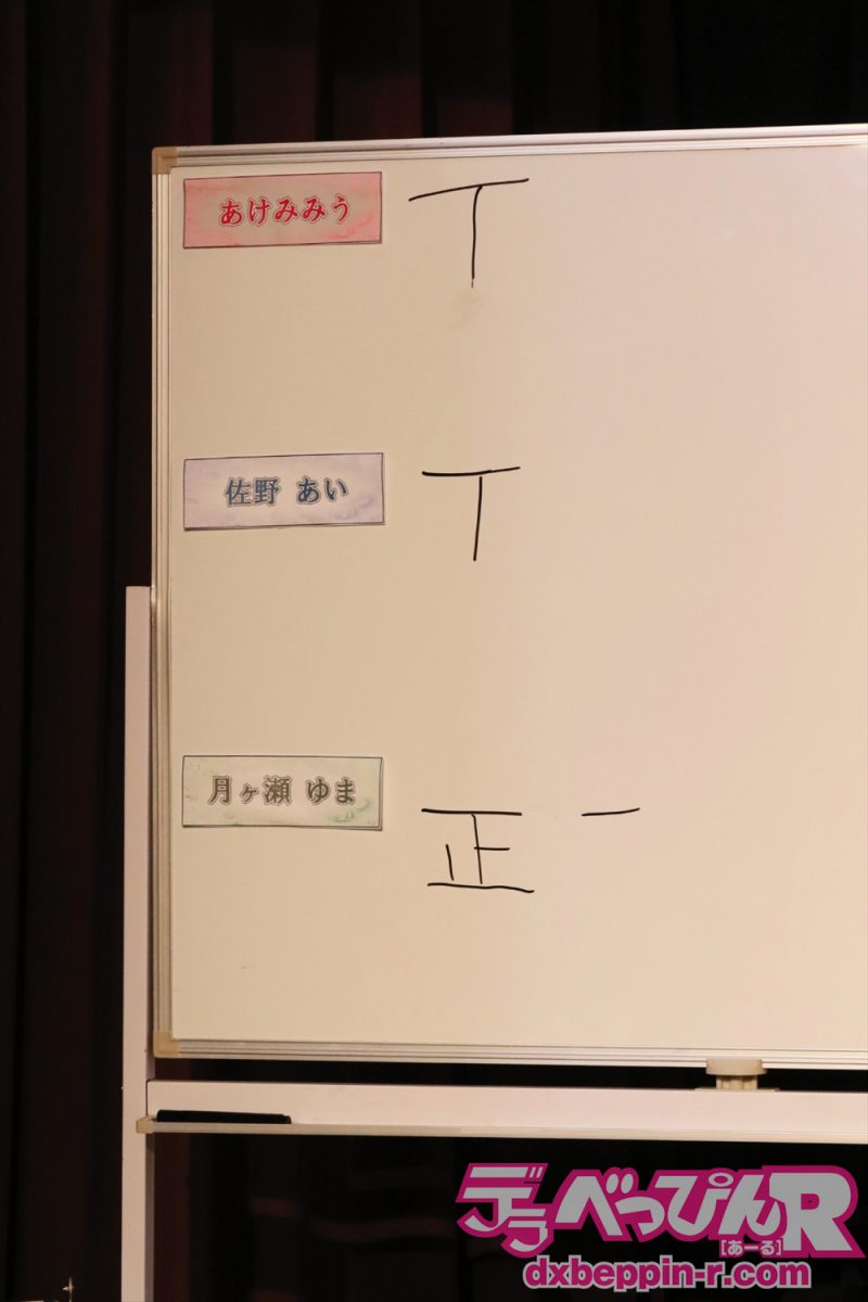 みうちゃんは0回、あいちゃんは2回、ゆまちゃんは1回ですが、ゆまちゃんは残念ながらトイレに行っていますので、そこで何度か放屁した可能性があります。しかし、大会の厳正なルールでは会場ステージで放屁しないとカウントされません。それだけ厳しいルールなのです。