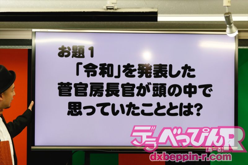 なぞかけや新元号ネタを取り入れ挨拶し、ファンを笑わせる出演者たち。良かった回答には座布団ならぬコンドームが与えられ、優勝者には金一封が授与。全員、お笑い本気モードで対決します。