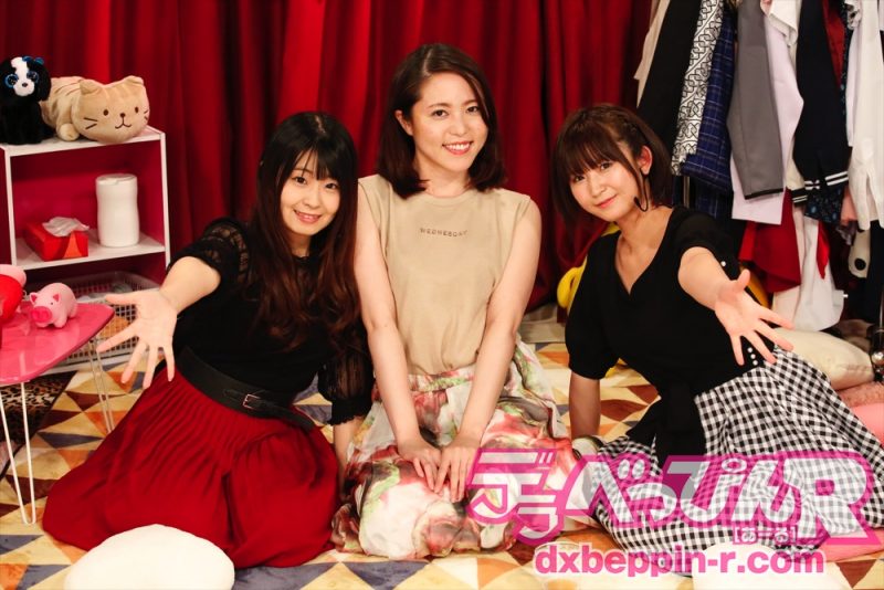 別室スタジオに移動し、いよいよ生放送が開始。3人のおっぱい公開からスタート。恥ずかしそうにブラジャーを外します。お互いに触ったり、乳首をつまんだりと早くもエロエロな展開になりそうな予感。