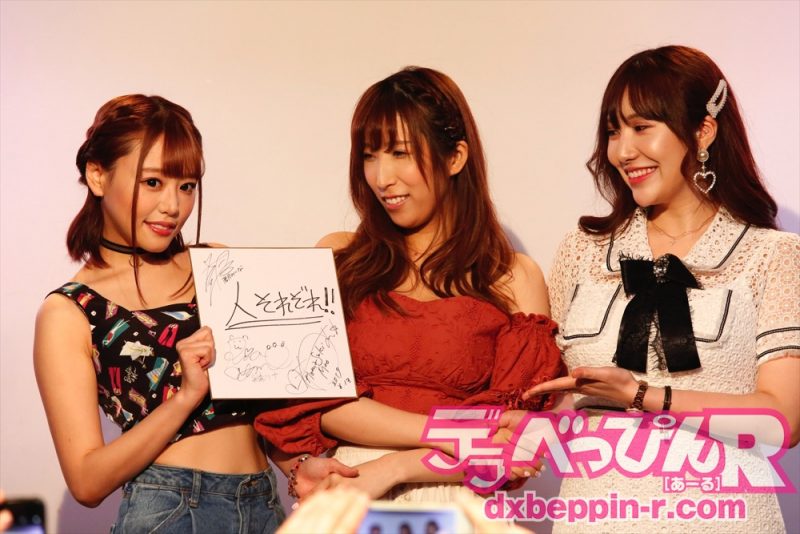 最後はイベント恒例の生パンティプレゼントも行われ、脱ぎたてホヤホヤの生脱ぎパンティがプレゼント。締めの挨拶ではイベントが無事に1周年を迎え、3人ともファンに感謝の言葉を述べます。