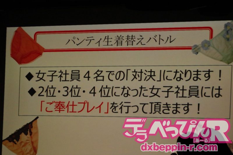 最初のゲームは「パンティ生着替えバトル」。女子社員4人がスカートを穿いたままパンティ10枚を脱着、その速さを競います。また、1位以外の女子社員はファンに「ご奉仕プレイ」を行います。