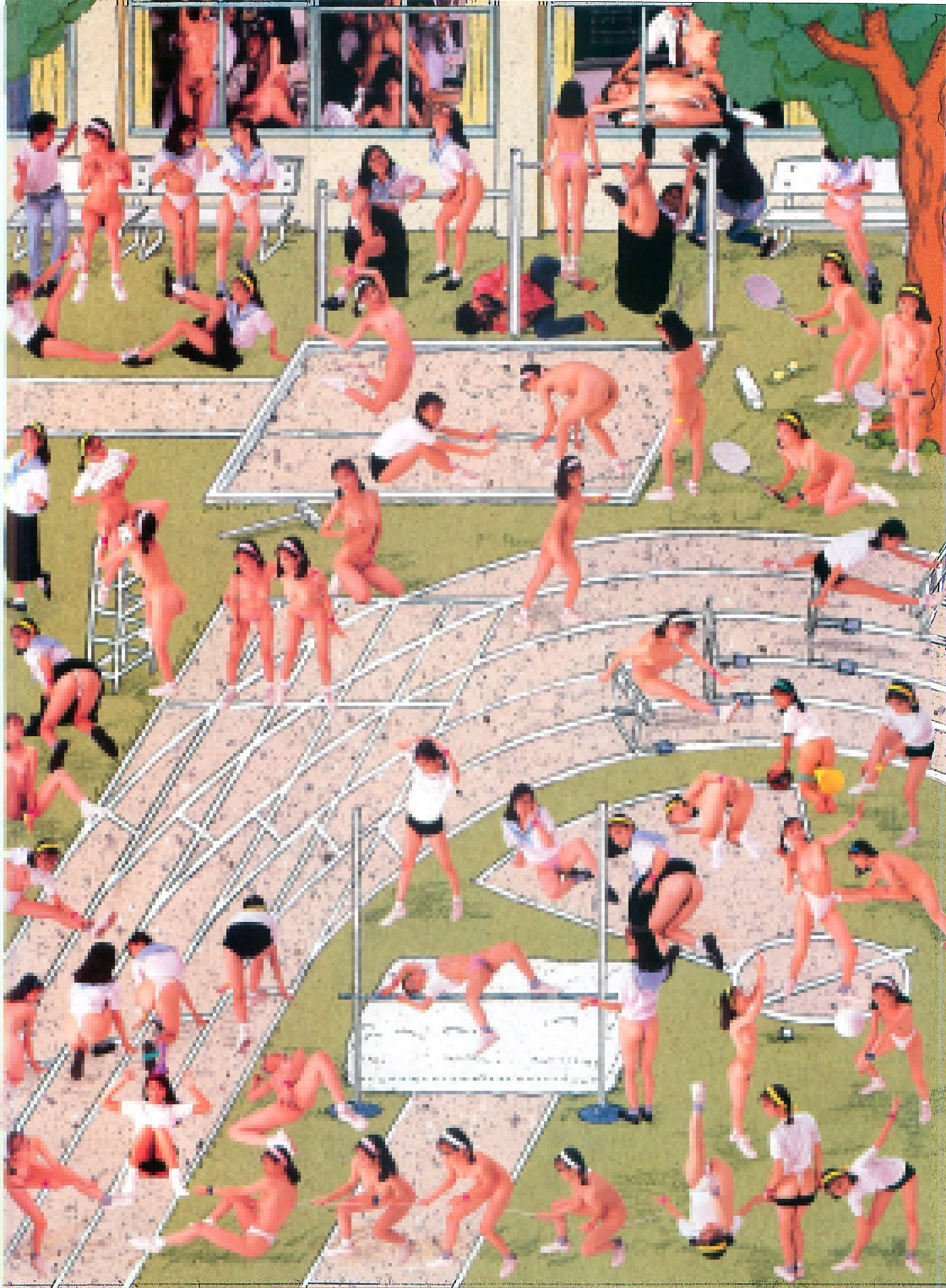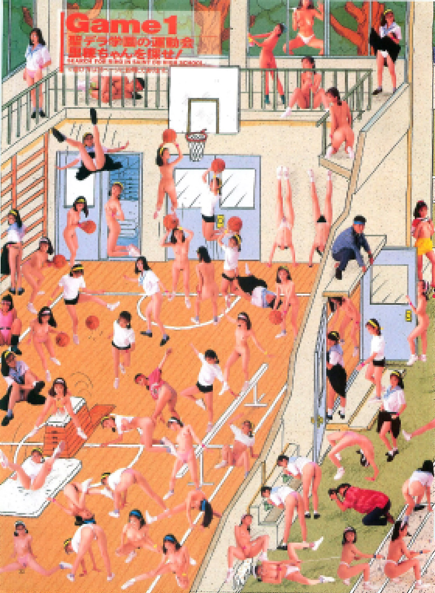 見開きで2ページにわたり、学校の運動会をイメージした舞台(イラストの上に無数のハダカの里穂ちゃん(泣))で、あちこちにあるハダカの女の子の中から設問の「里穂ちゃんの人数」などを回答する、というデラべっぴんならではの予想の斜め上を行く「おもしろエロ企画」。