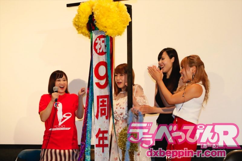 そして、上野オークラ劇場の新館立て直し9周年を祝い、舞台挨拶に登壇する女優陣ときみと歩実ちゃんでお祝いのくす玉割が華々しく行われました。