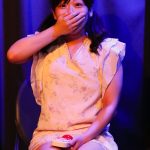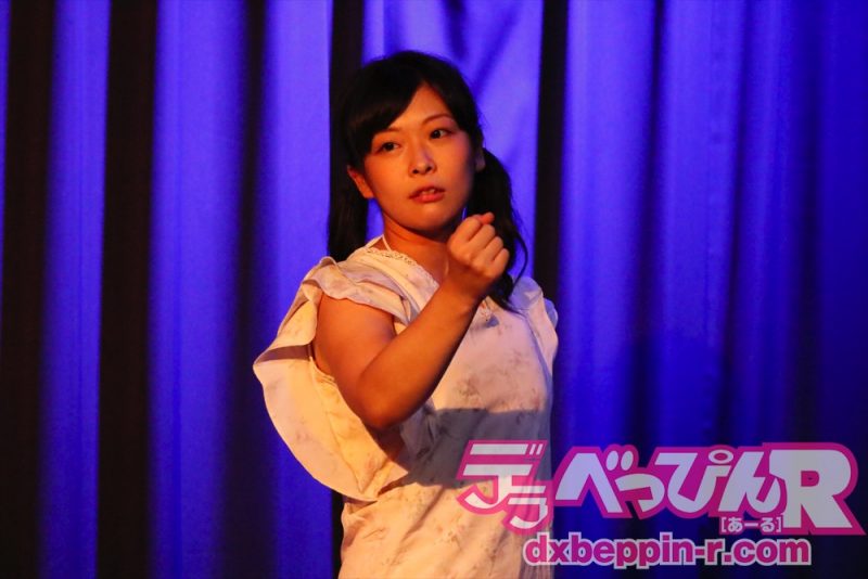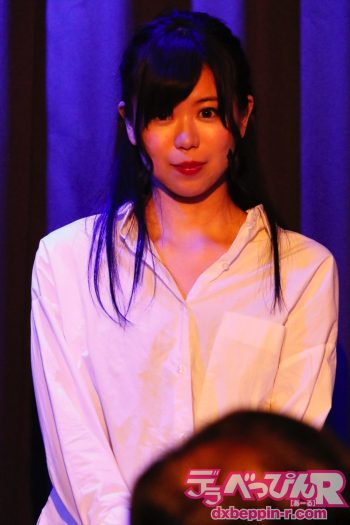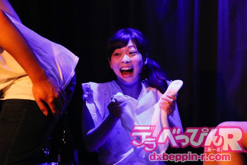 ますます加速してきた催眠術。後半は原美織ちゃんの女性器が何故か空中浮遊。観客の指先に飛び移り、観客や宮村ななこちゃん、星川凛々花ちゃんにエア愛撫をされると、「アア、アア~」と喘ぎ声を上げ、目がうつろになる原美織ちゃん。最後は何もない空中をグチョグチョにイジられて、腰砕けになり大昇天! もはや失神状態の原美織ちゃんでした。