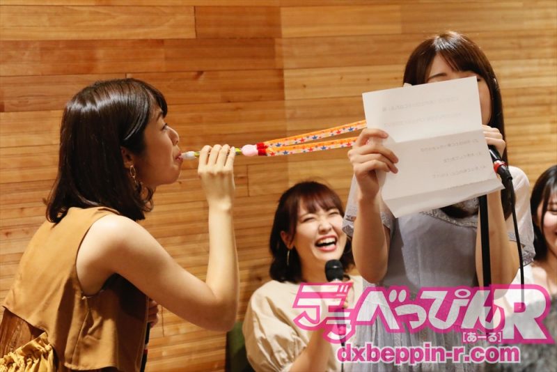 先輩の熱演を見た佐藤ゆかちゃんは「私、こういうの慣れてないから優しくしてね。大きくて壊れそう……」と感情を込めてセリフを読むと、笛のピロピロ音が会場中に響き渡ります。さらに続けて「イッちゃう、イッちゃう」と言うとピロピロ音はマックスに。新人は何をしても許されるんです!