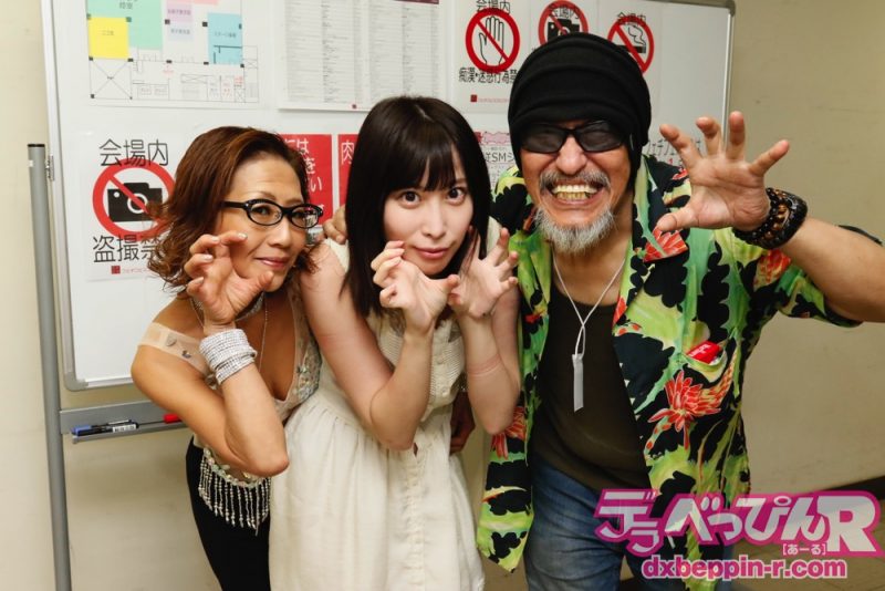 AVメーカーの「ドグマ」ブースに向かおうとしたところ、奇遇にも葉月桃ちゃんとTOHJIRO監督に遭遇。しかも、これまた偶然通りかかった三代目葵マリーさんもキャッチ! スペシャルな3ショットが撮影できました。これは縁起が良い!