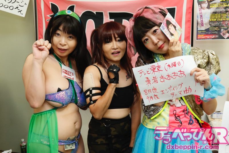 THOGOさん率いる「キャットファイト団体CPE」ブースでは27日に行われるキャットファイトなどをPR。みでぃさん(写真左)、ナナチャンチンさん(写真中央)、中村ピアノ(写真右)さんの3ショットです。