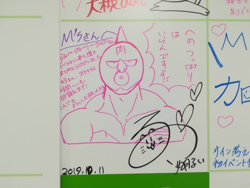 妃月るいちゃんといえばキン肉マンというほど、セクシー女優界、いや、日本でも有数のキン肉マン好き。秋葉原のイベント会場には何とキン肉マンイラスト付きのサイン色紙も飾られています(笑)。