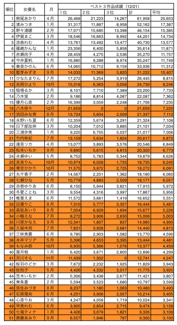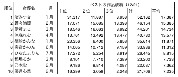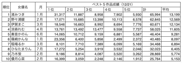 さて、以上で前回9月に発表しました上半期の女優さんたちと合わせて2019年組のガチ勢女優さんたちが出揃いました。これを2019年12月21日現在のリーディングという形でまとめた表がこちらです。