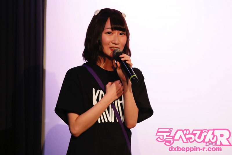 丸山れおなちゃんは自己紹介も兼ねて「クローネいちの問題児、丸山れおなです。このイベントはベロベロになったこにたん(小西まりえ)先輩のケツが見えるイメージ。目標は生きる」と挨拶。