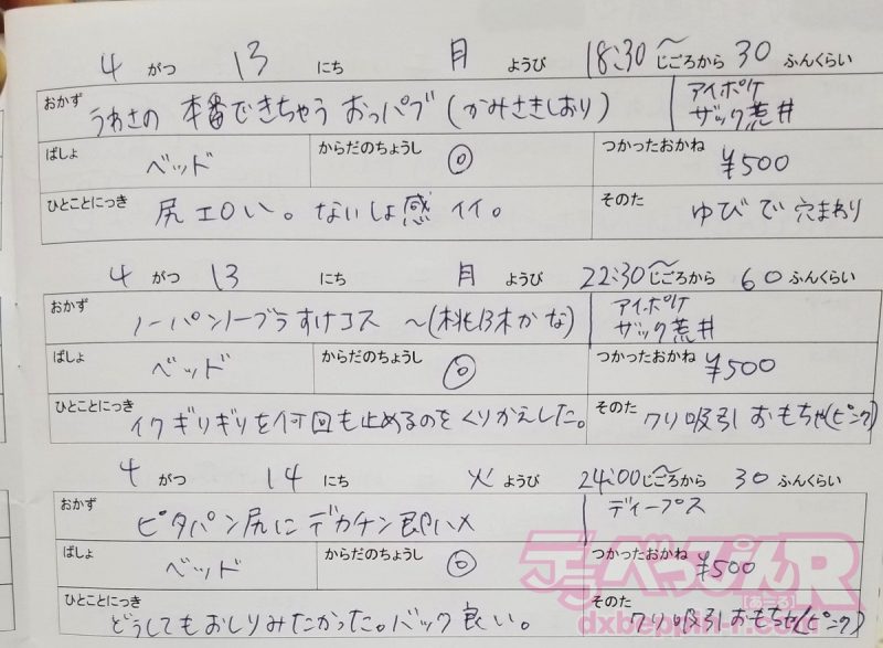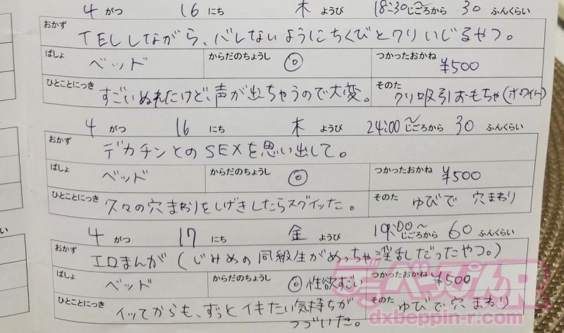 4月13日から30日まで、17日間に渡り完全プライベートな赤裸々オナニーライフを直筆でしこしこ記録してくれました。