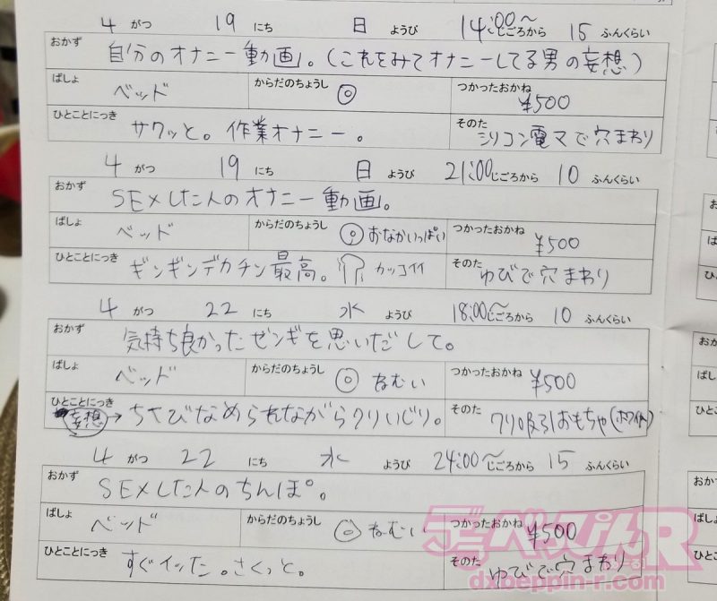 17日間で合計18回、利用金額は9000円とのこと。「なんか微妙な数でした〜もっとしたかったです」とご本人談。その原因として「3月に高いWi-Fiを解約しちゃって4月は速度制限かかって、全然動画が見れなかったんです。地獄のオナニー期間でした」と正直に暴露してくれました。いやいや、そのジレンマも伝わる臨場感溢れるオナニー記録をありがとうございました!