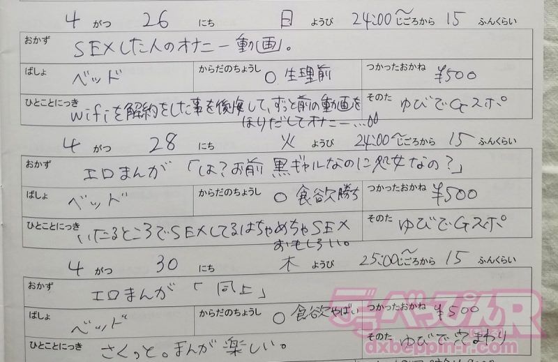 28日からはお気に入りのオカズを見つけたようで黒ギャル系のエロ漫画を2日に渡り使用していました。ただ、このあたりはは女性の周期の問題なのか食欲が性欲に勝ってしまったとのこと。30日の最終日もサクっと手軽なオナニーで終了したようです。