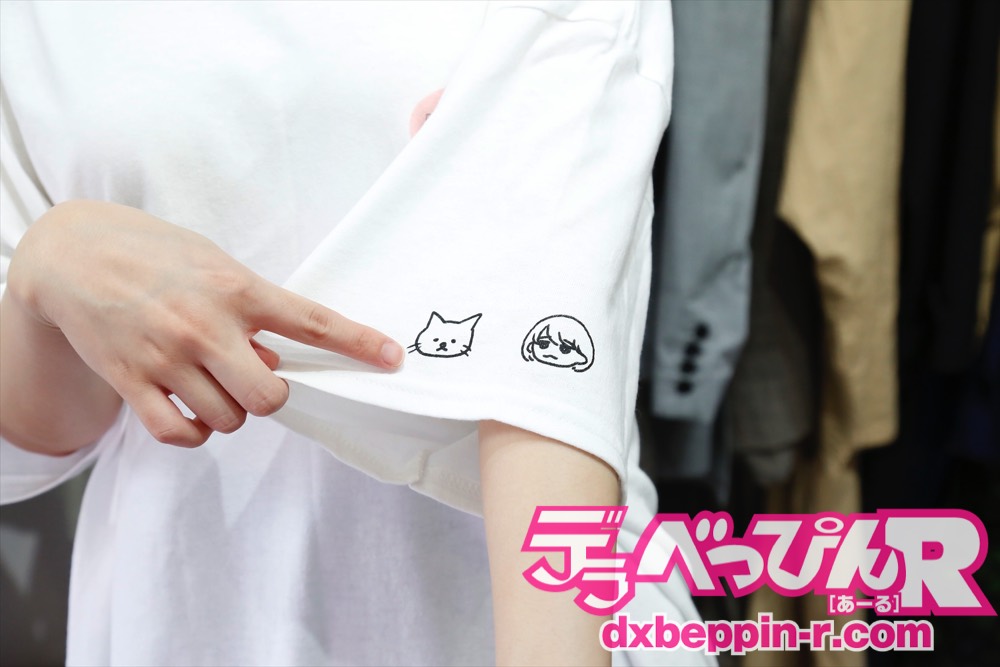 そのコラボアイテムは何かと聞くと、「Tシャツは『架乃と猫』といって、袖に私が手書きで描いた、私と飼い猫のイラストがあって、後ろにも飼い猫と一緒に撮った写真をプリントしてもらいました。ロンTはバックに私の写真がプリントされています。私のファンが身に着けてもらうアイテムだから、私がいる方がいいと思ったし、私が一番好きな猫もファンの人にかわいがってもらえたらと思い、大好きな猫も一緒にプリントしました」と2種類のアイテムを紹介してくれました。