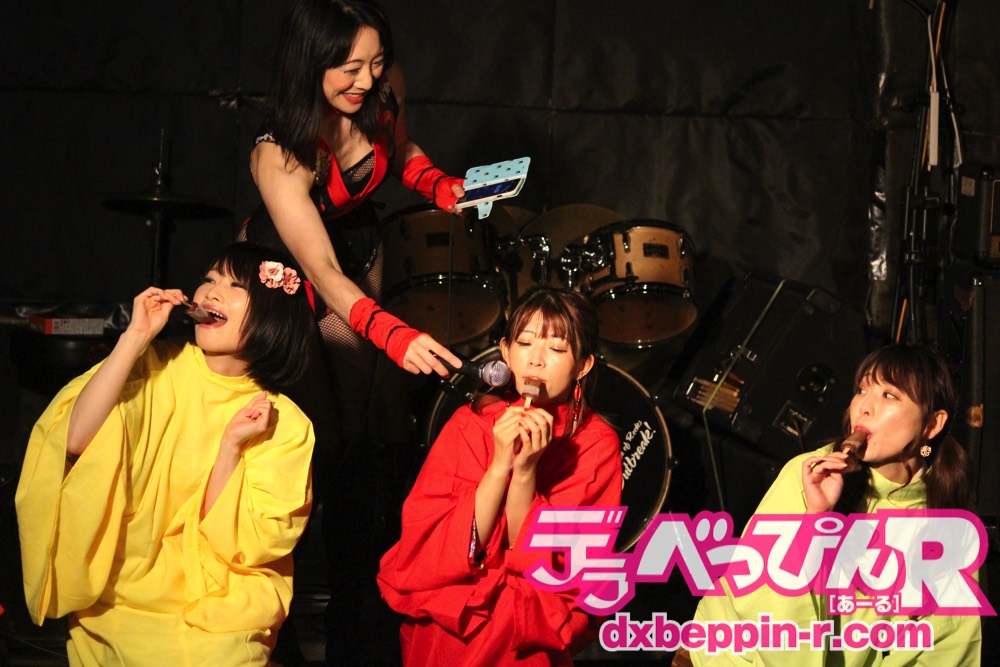 続いてのコーナーは「」。細長いモノをお口に咥え、それをどれだけエロく魅せることができるかを競うという眼福すぎな企画です。まず一回戦は中に白いもの(クリーム?)がたっぷり詰まったチョコ味の棒状アイス。ゲストメンバーからの挑戦です!