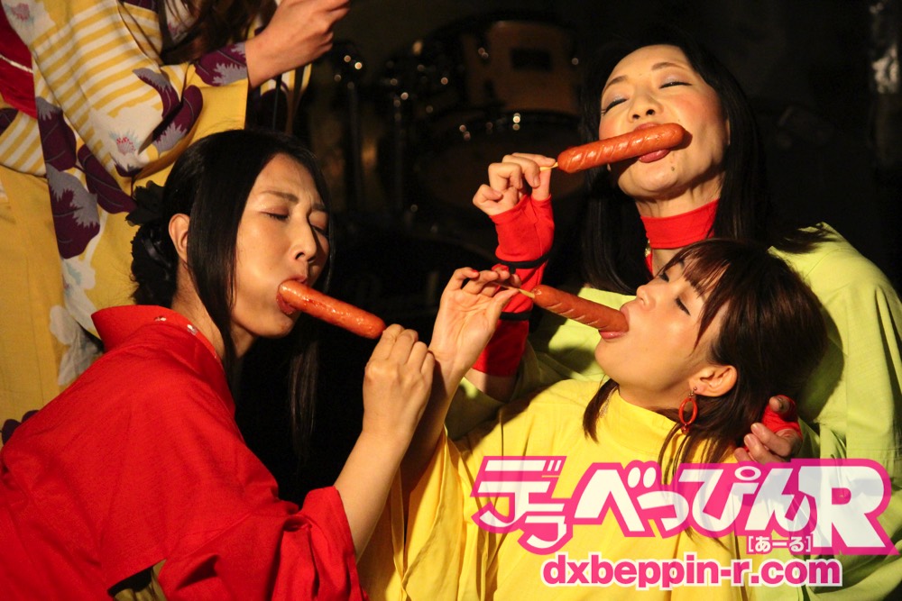 決勝戦はアイスに代わり、巨大なフランクフルトでのパフォーマンスとなりました。ケチャップをたっぷりつけたフランクフルトが3者3様の口技でしゃぶられていきます。
